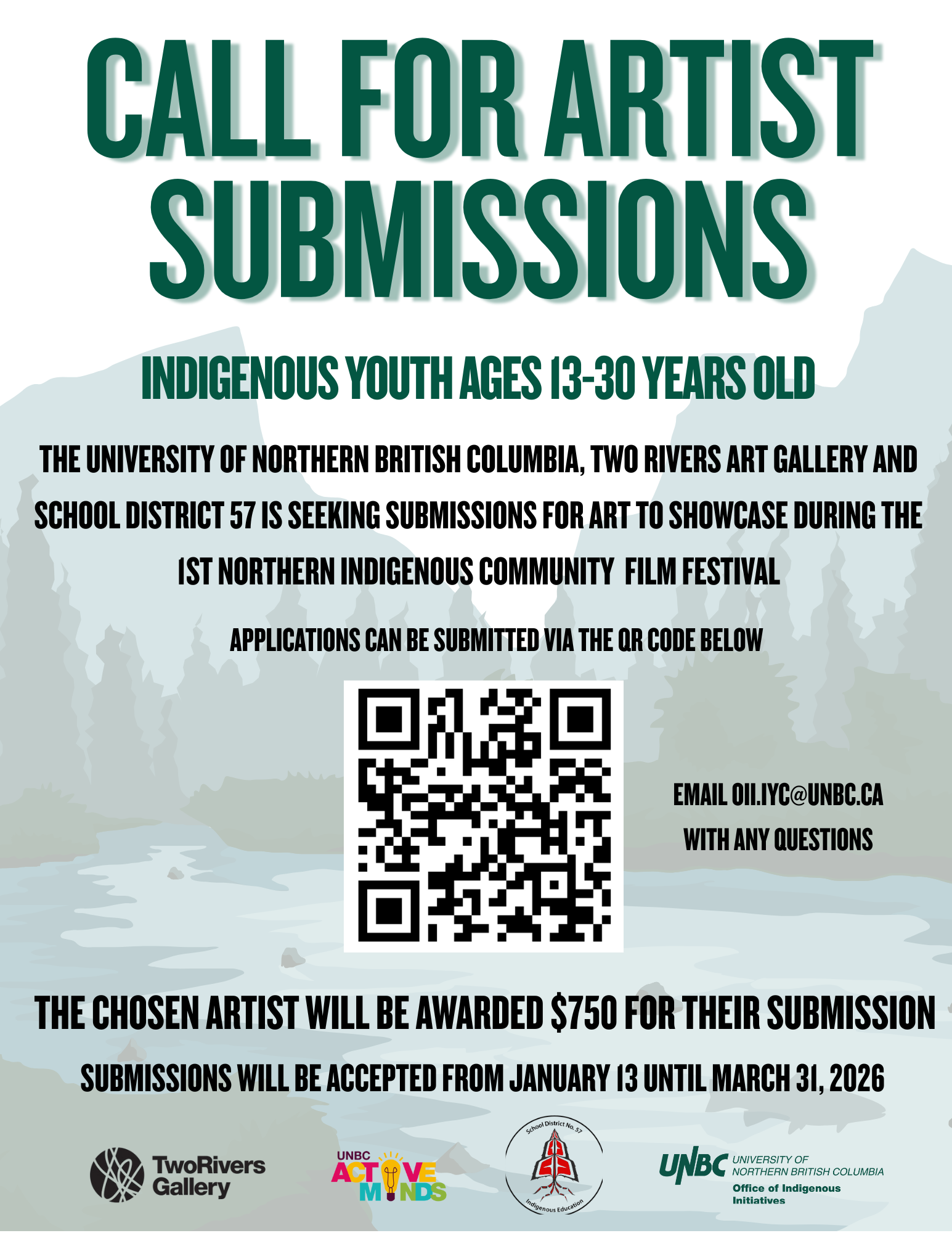 Call for Artist Submissions UNBC, Two Rivers Art Gallery & SD57 is seeking submissions of art to showcase during the 1st Northern Indigenous Community Film Festival.